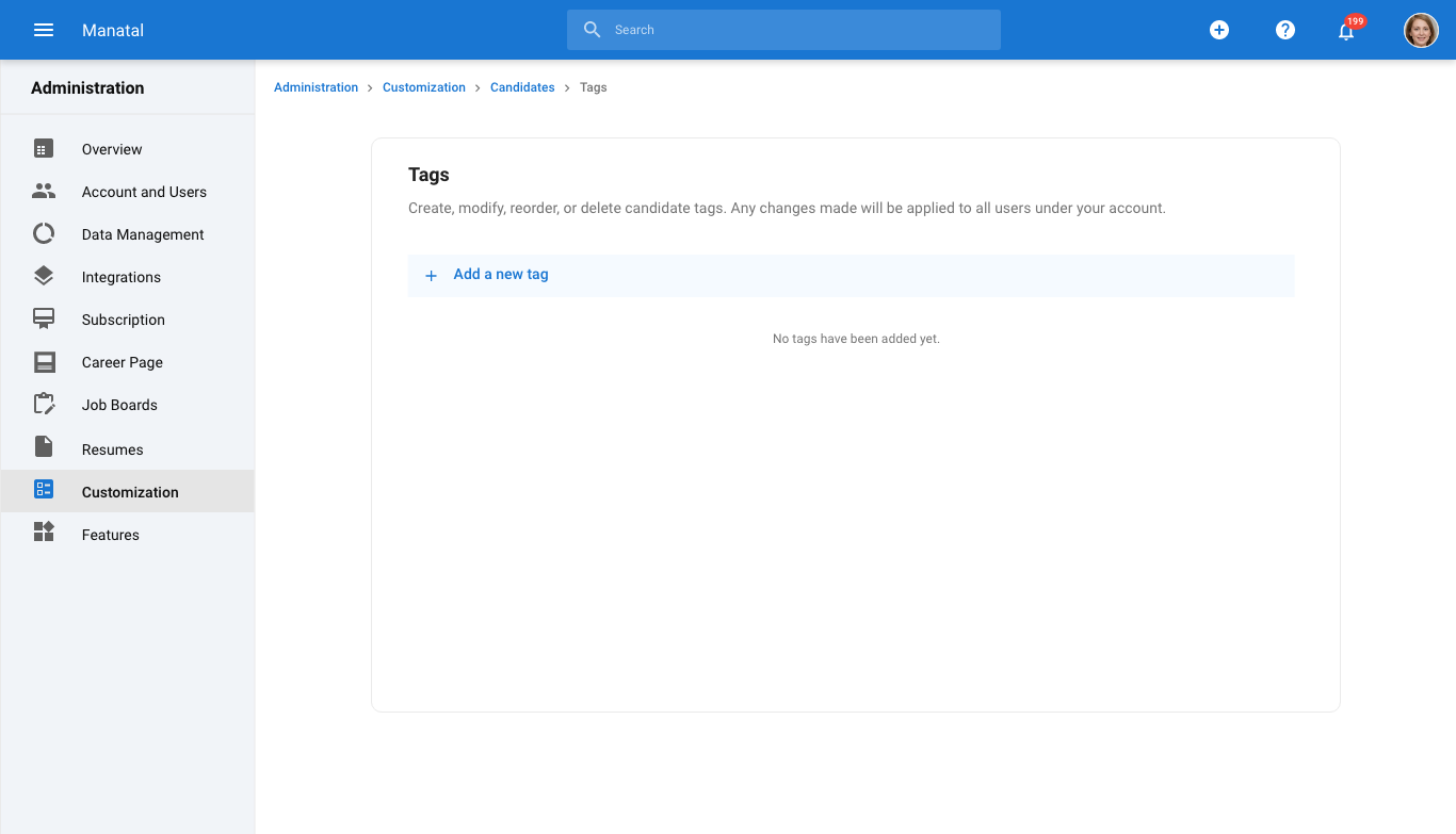Manatal Administration Page — the administration page helps user set up features within the Manatal application. The sections are divided clearly with specific settings options in each of them.