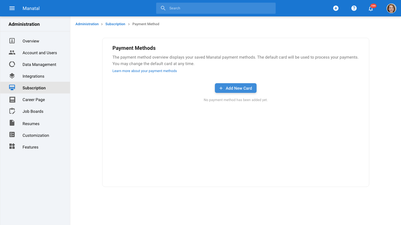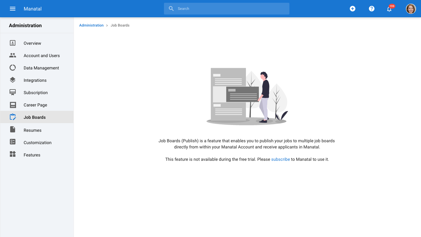 Manatal Administration Trial Software Page — Administration page shown to user with trial software. User can choose to subscribe before trial ends and cancel subscription anytime.